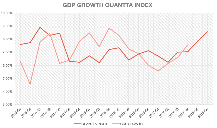 Dr. Rajiv Kumar, Vice Chairman, NITI Aayog said “The Leading Economic Indicator Index being developed by Quantta Index in collaboration with NITI Aayog was put up on the website of Quantta at www.quantta.com/quantta-index on the 29th of August 2018. Their analytically designed and empirically validated estimate of 7.83% Q1 GDP growth are a shade below the GVA of 8.00%. Congratulations to the entire team for being proven right”
