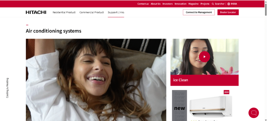 Hitachi partnered with Johnson Controls, making it a Japanese-American brand. The company has had a long history in India since the 1980s. This joint venture just combines Hitachi’s Japanese technology with global expertise. Their ACs feature expandable inverters, which means a 1.5-ton Hitachi AC can expand to a 1.7-ton AC if outside heat is extreme. Products range from split ACs to commercial chillers. Hitachi is known for quiet operation and quick cooling.